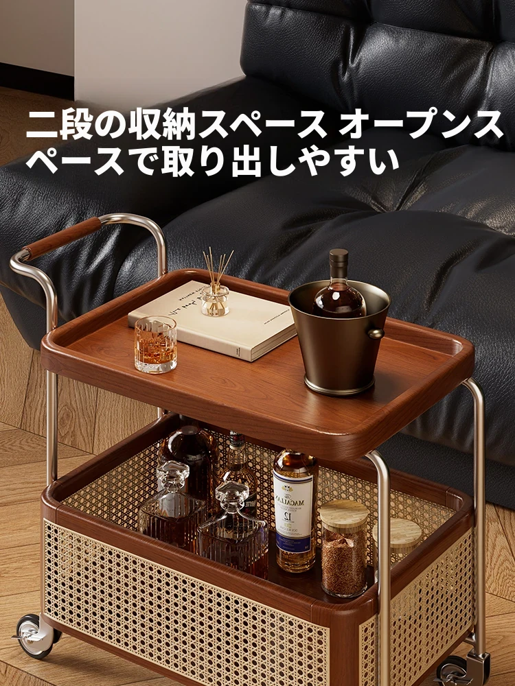 無垢材の移動式キャスター付きサイドテーブル|ステンレス収納のヴィンテージ風小さなワゴン|リビングにぴったりなシンプルでおしゃれな収納|ラタン編みデザインで温かみのある空間を演出