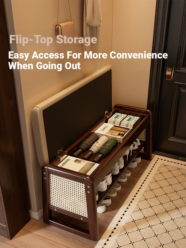 Elegant Solid Wood Shoe Bench with Storage - Stylish Entryway Shoe Cabinet and Seating, Rattan-Woven Design, Perfect for Home Use, Modern Long Shoe Rack for a Chic Entrance.