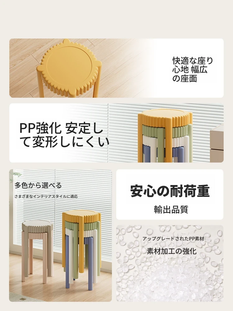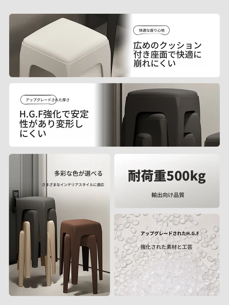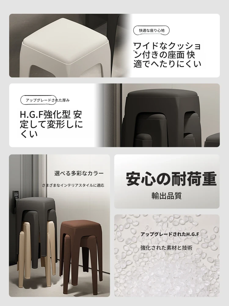 家庭用プラスチックスツール|頑丈で耐久性抜群!|現代的でシンプルなデザイン|省スペースで収納便利|柔らかいクッション付きの四角いスツール|積み重ね可能でお部屋をスッキリ!