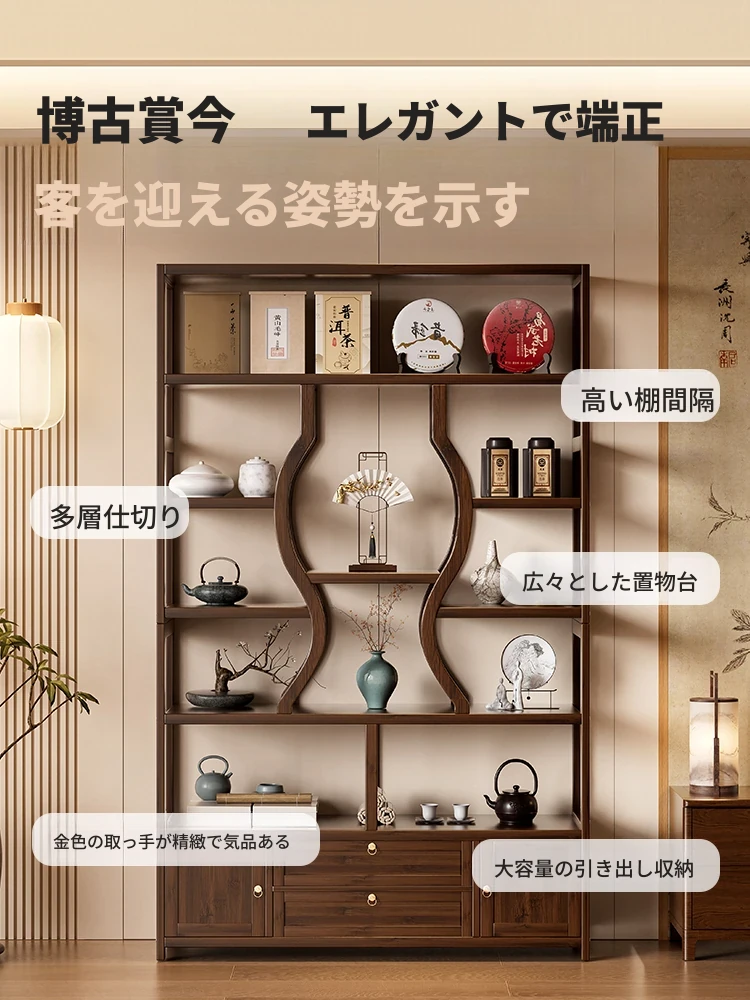 シンプルでモダンな無垢材の博古架 - 壁に寄り添うおしゃれなティーキャビネット。茶室にぴったりの収納棚で、茶葉や茶器、装飾品を美しくまとめて、心地よい茶のひとときを演出します。