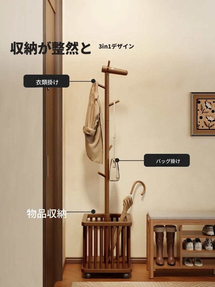 天然木製のスタイリッシュなハンガーラック - エントランスやリビングに最適なコンパクトサイズ、バッグや衣類をすっきり整理!おしゃれなデザインで、どんなインテリアにもマッチします。