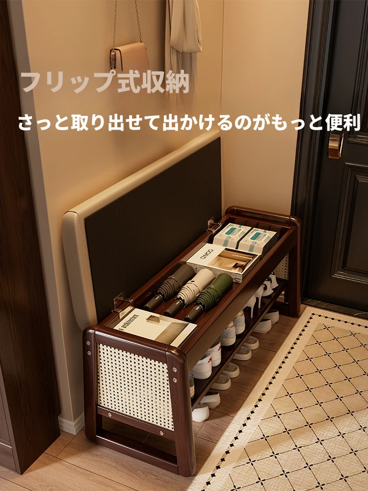 高級感漂う実木製シューズベンチ&収納ラック!玄関を彩る藤編デザインで、おしゃれな入居者の必需品。靴をすっきり収納しながら、快適に座れる新感覚のロングベンチ。